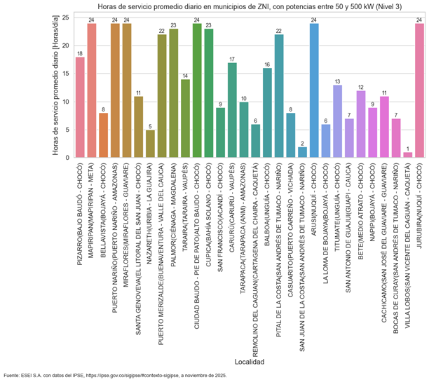 8. Localidades Nivel 2. Hay siete localidades, con demandas entre 0,5 MW y 2 MW. Estas localidades tienen la misma problemática que se planteará para las localidades Nivel 3, pero por ser localidades más grandes sus potencias y horas de servicio son más altas. Son las siguientes: Providencia (1,9 MW), Puerto Leguízamo (1,9 MW), Ciudad Mutis (1,5 MW), Acandí (1,3 MW), Unguía (0,99 MW), Cumaribo (0,83 MW) y Nuquí (0,54 MW). Las horas de servicio promedio de estas localidades están entre 20 y 23,9 horas por día.